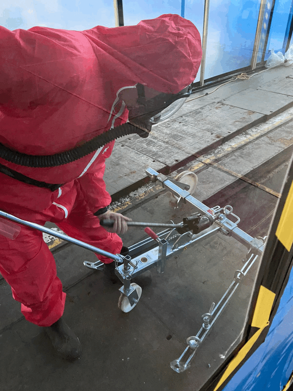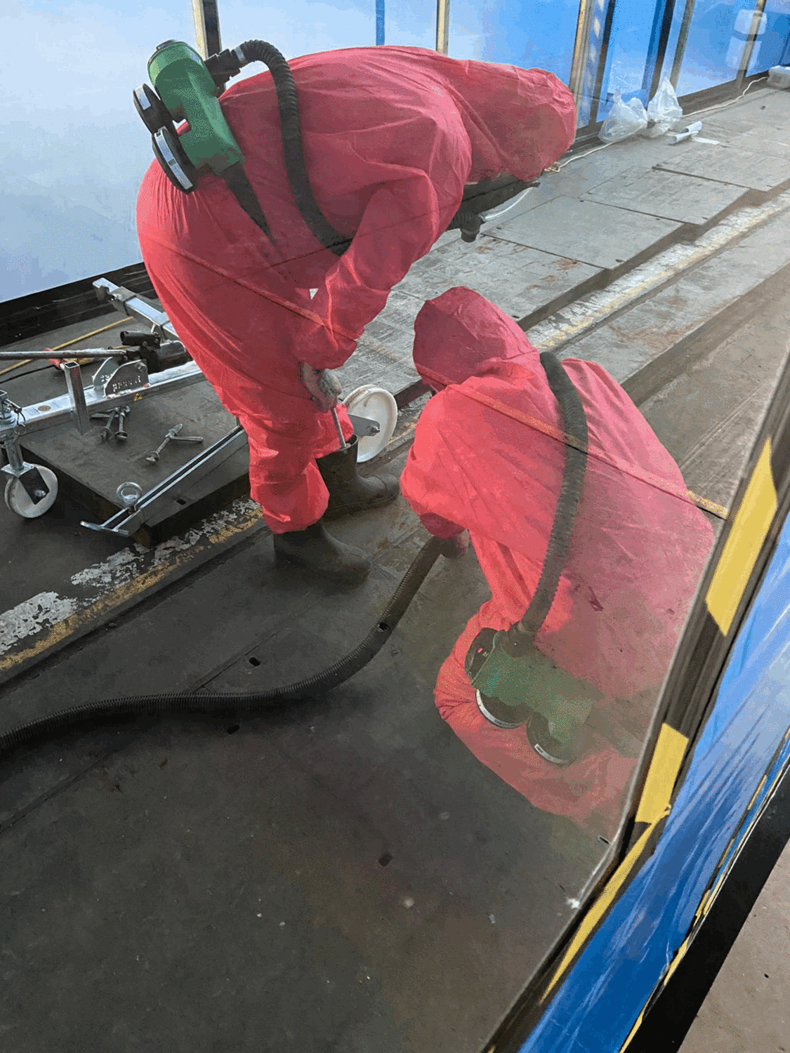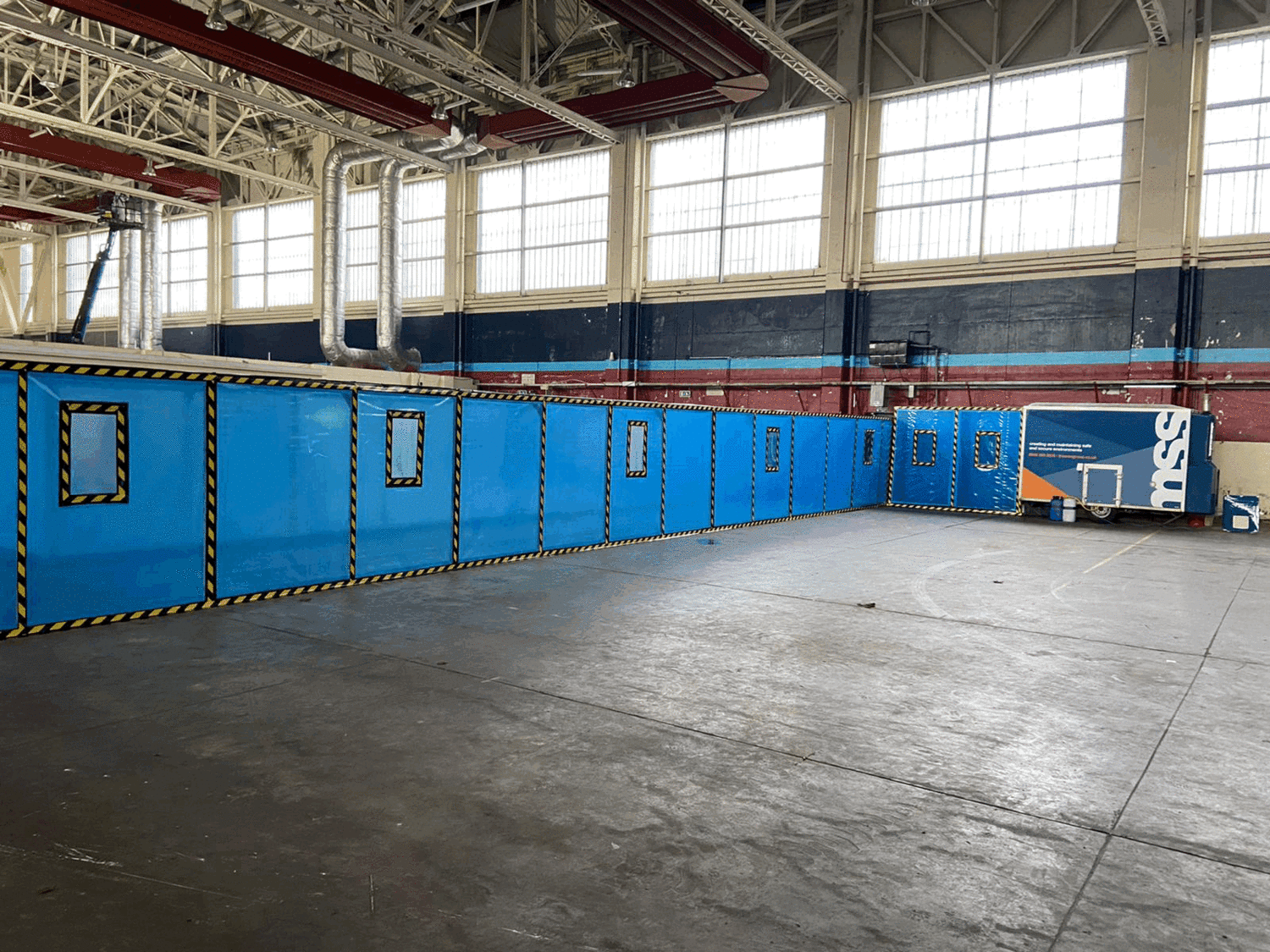 Our team undertook decontamination of thermal insulation debris in ducts within an RAF hangar. This 60 meter long, 2m high enclosure was built over 4 days by a team and decontamination of the ducts was completed over a 10 day period. Duct covers were removed using a hydraulic slab lifter to allow access into the ducts, which were half a meter deep and contained cabling.