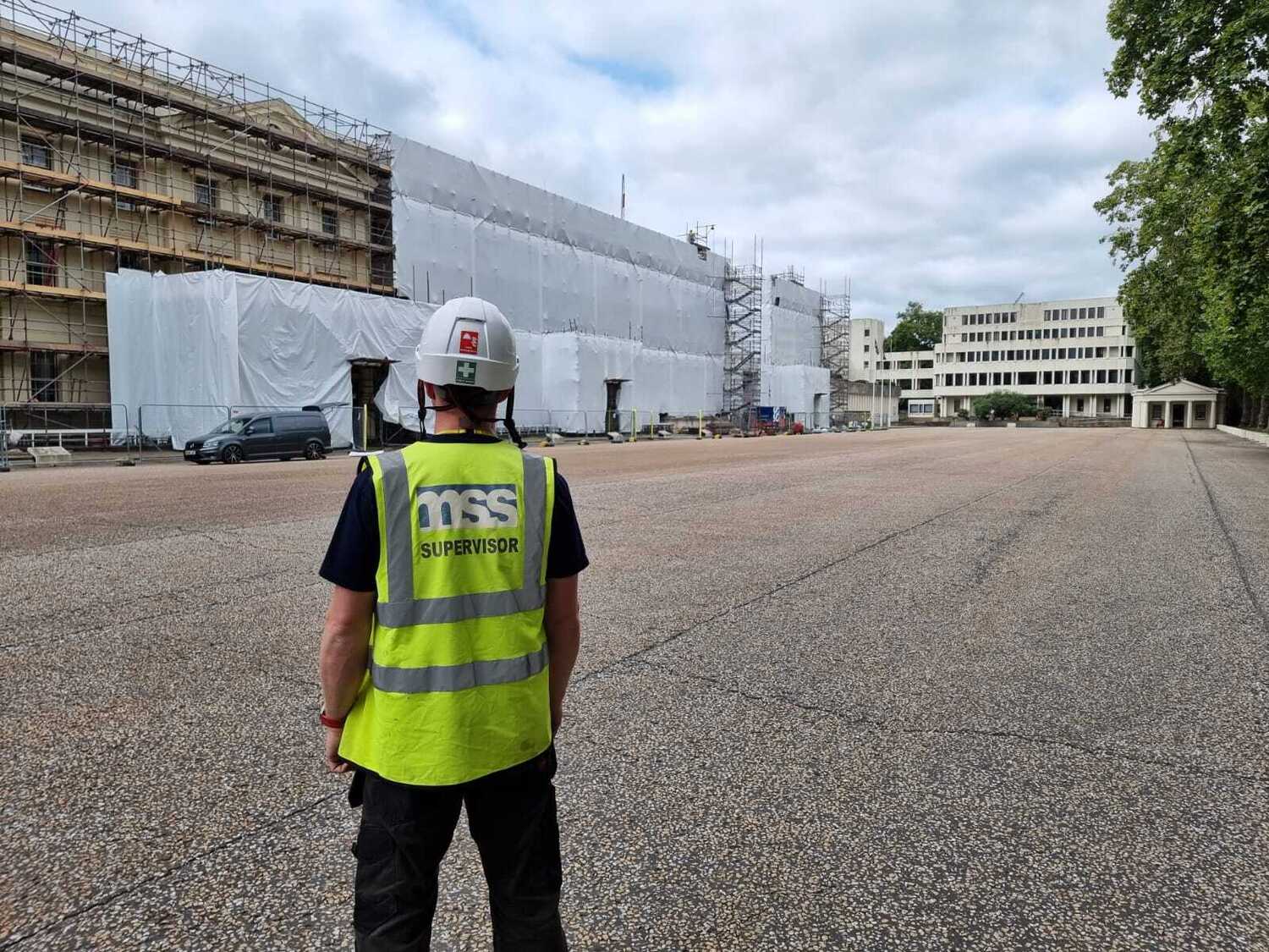Wellington Barracks, which is a high-profile site, remained fully operational during works, with regular parades continuing immediately in front of the enclosures. Consideration for maintaining a clean and well presented areas which MSS were responsible for were priorities alongside safe working. The structure including the enclosures were designed to withstand regular helicopter activity at the front of the building.