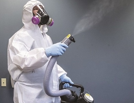 Our teams utilise a mobile fogging unit, which is filled with disinfectant solution. The equipment supersaturates the atmosphere with a disinfectant fog. Under typical conditions, fogging is carried out for a minimum of 15–30min per room to enable the fog to disperse and the chemical action to occur.